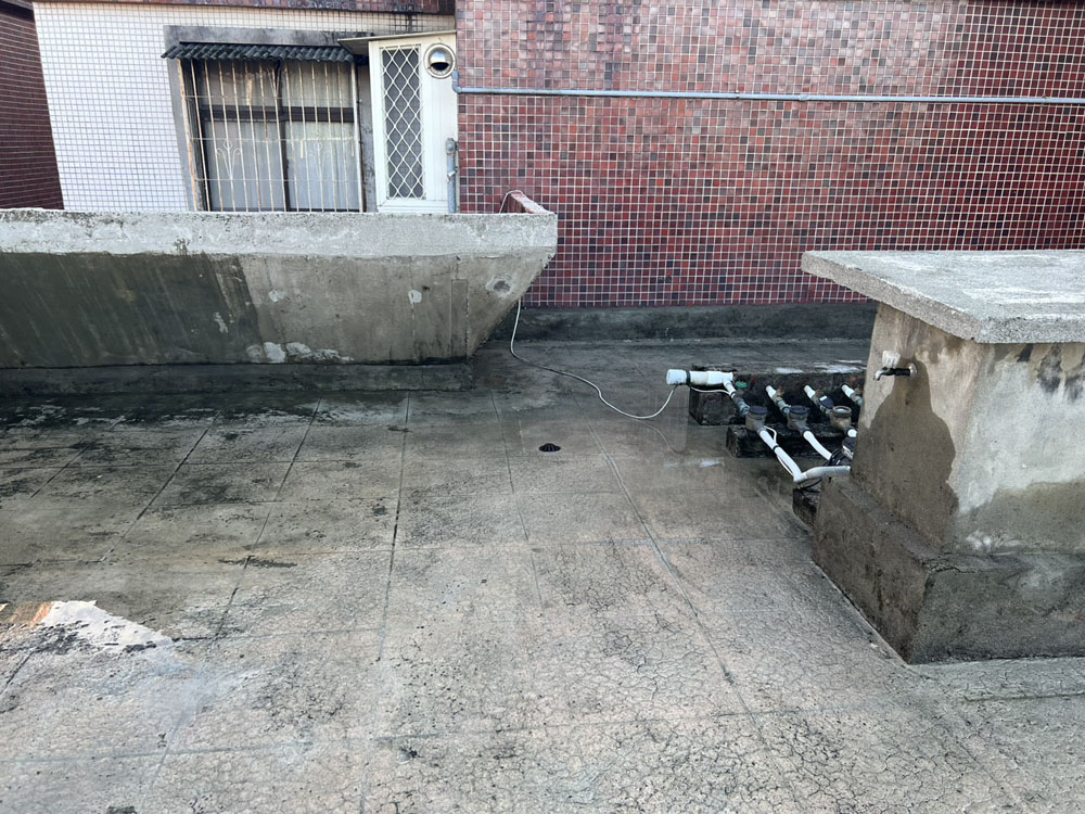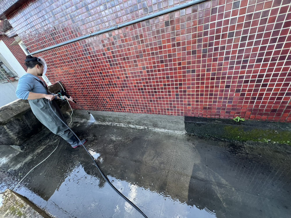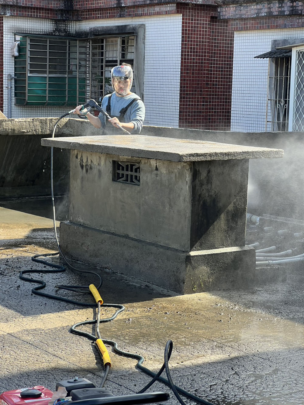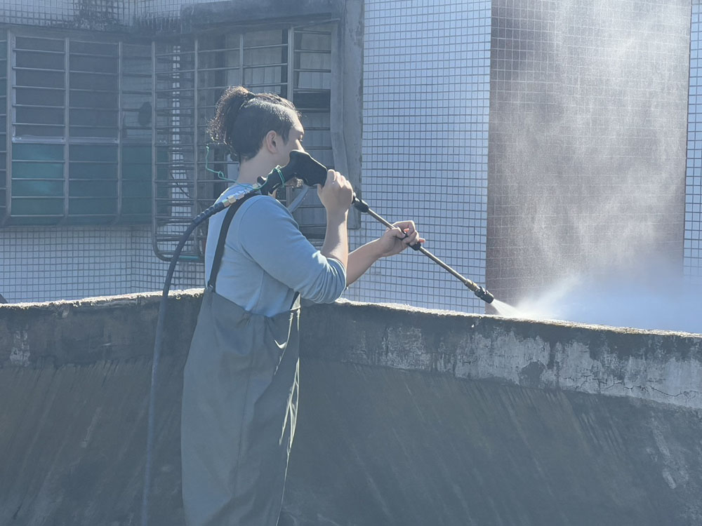頂樓先進行高壓清洗去除油污與粉塵,再施作防水層,確保基面乾淨提升附著力並延長防水使用年限