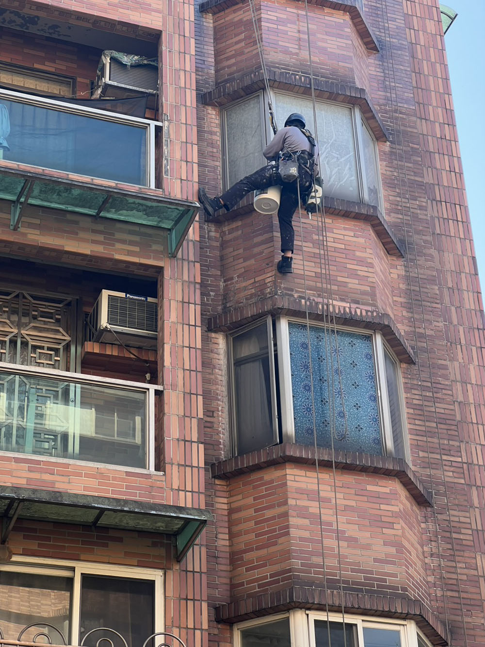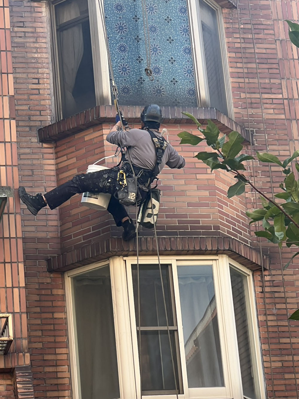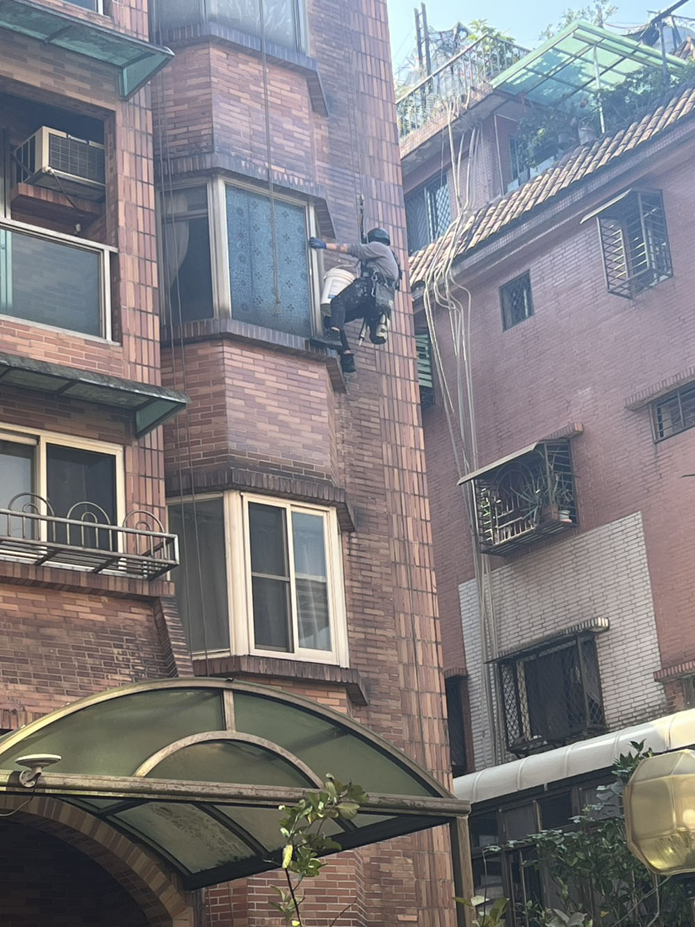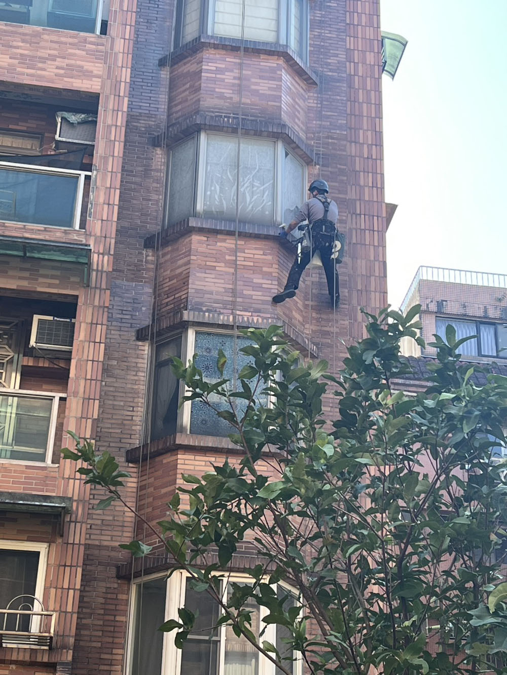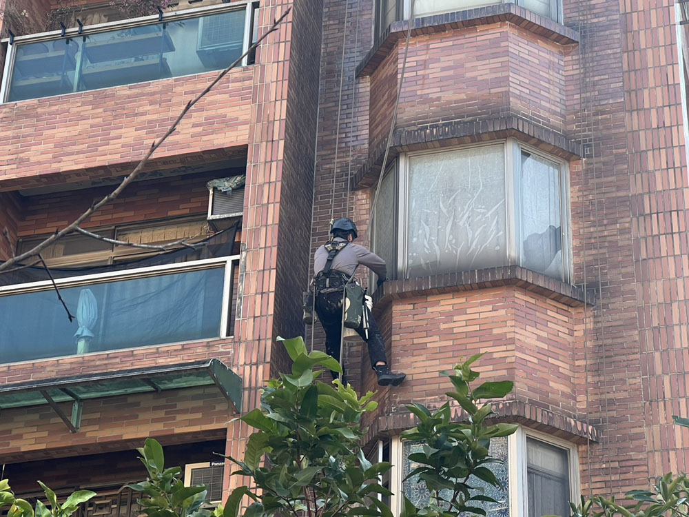 採用蜘蛛人高空作業方式進行外牆防水施工,無需搭設鷹架即可快速處理高樓外牆滲水問題
